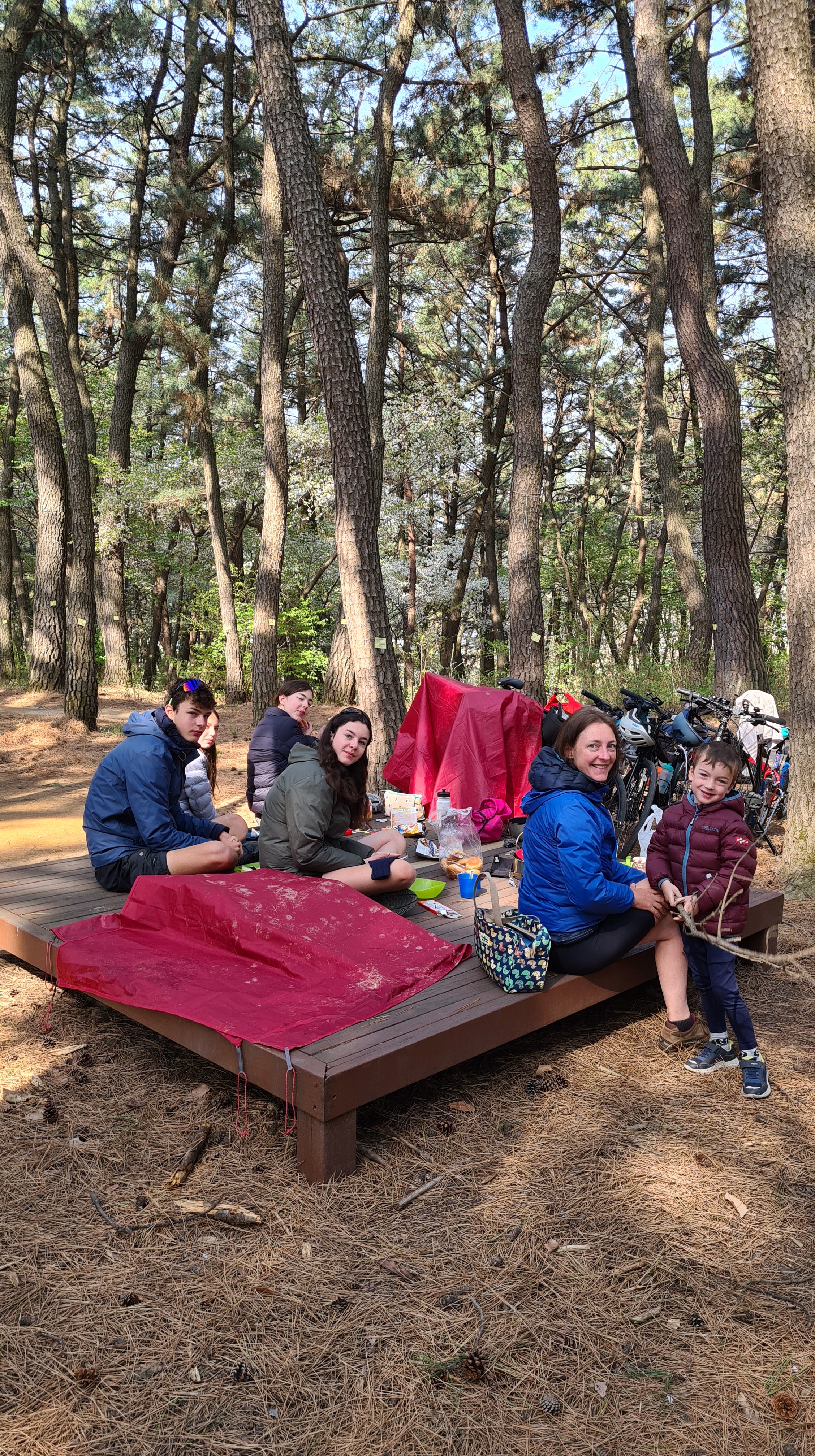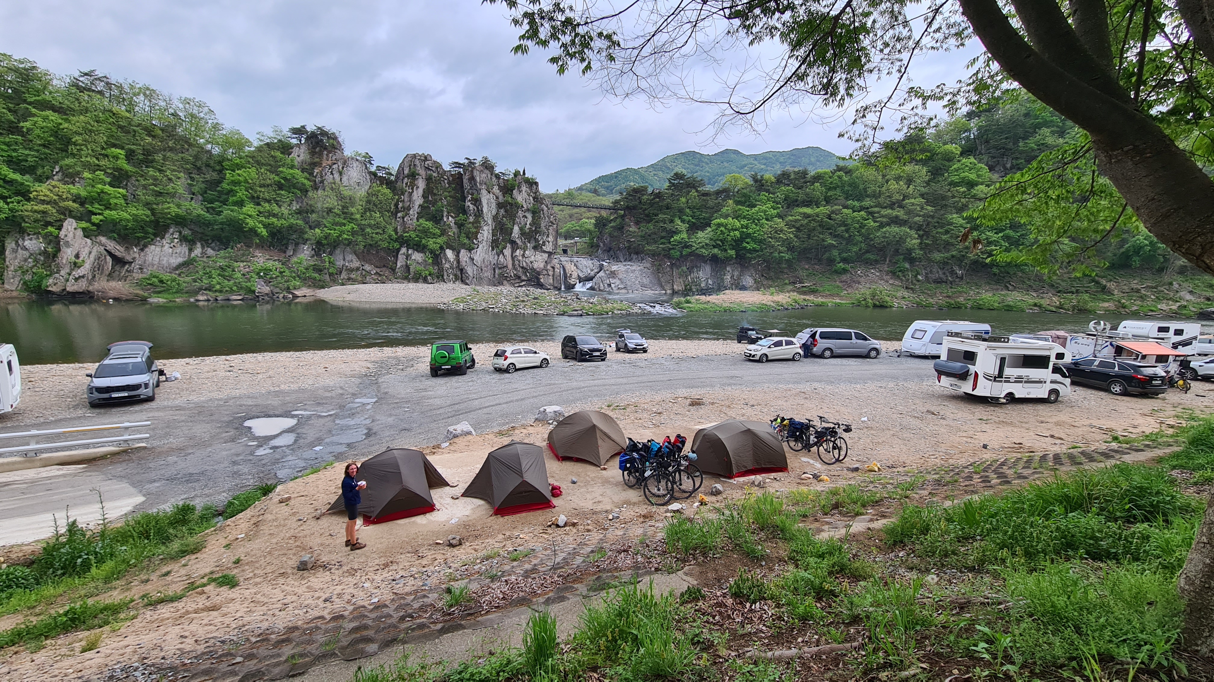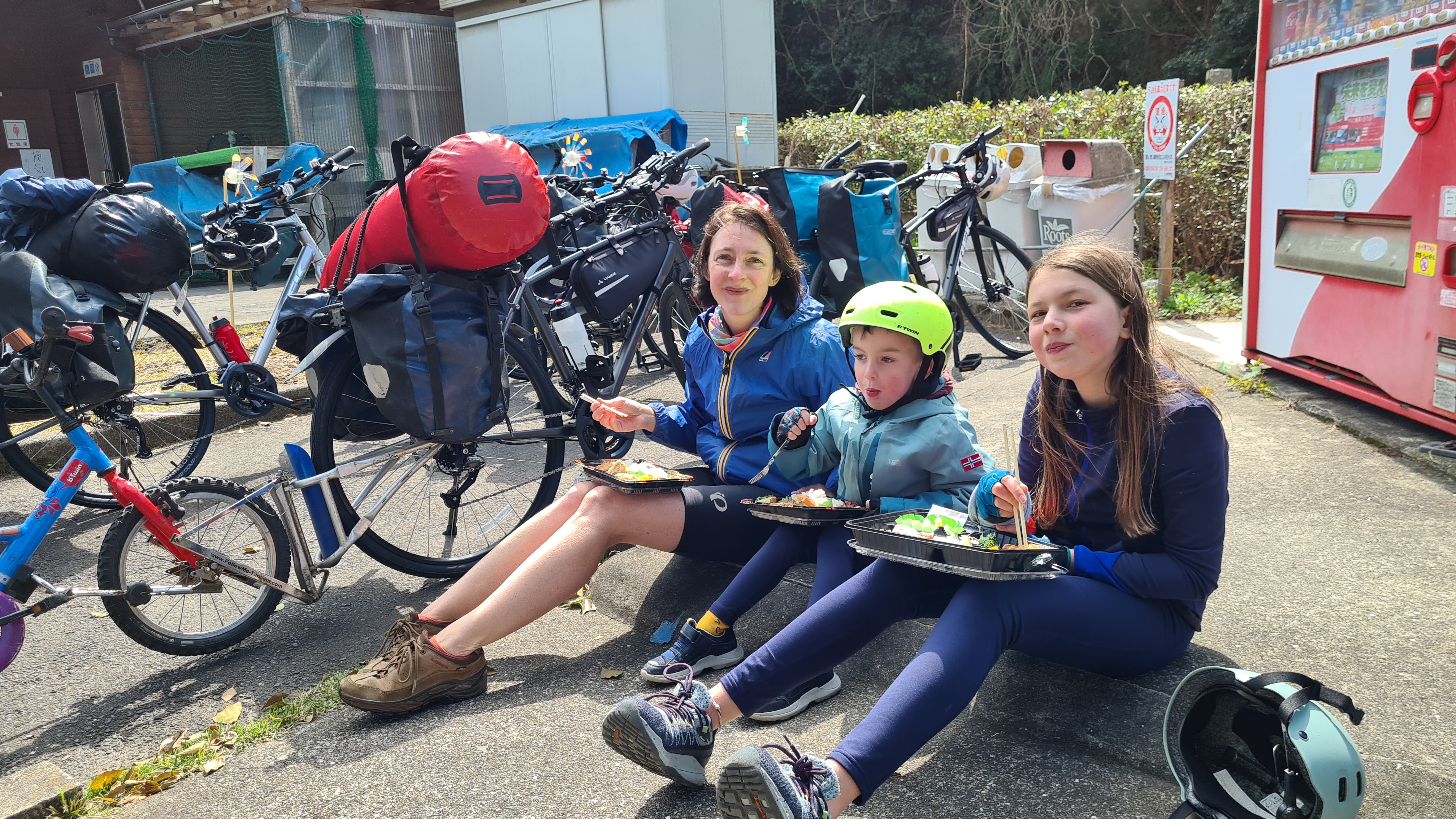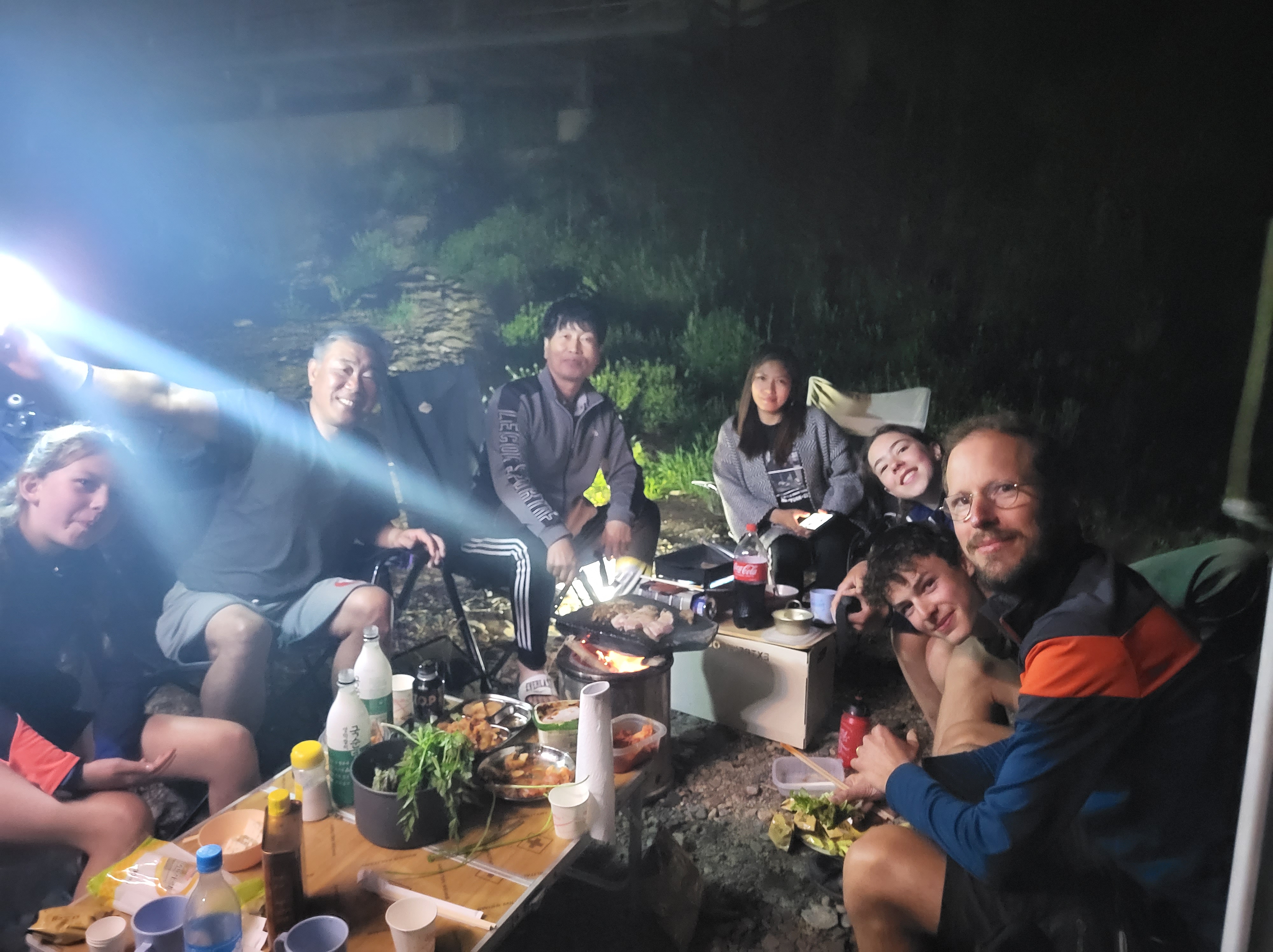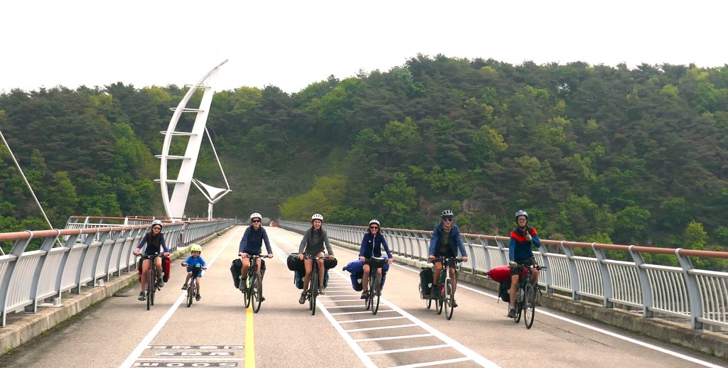 Au fil des kilomètres, nous continuons d’expérimenter la générosité extraordinaire des habitants. Des cyclistes s’arrêtent pour donner aux enfants les ravitaillements qu’ils avaient prévus pour eux. Dans les campings, il n’y a pas eu un soir où nous n’avons pas reçu de la nourriture (du kimchi bien sûr, le plat traditionnel coréen fait de légumes lactofermentés plus ou moins épicés), une table et des tabourets à prêter (on devait faire un peu pitié accroupis autour de notre butagaz…), et jusqu’à … 5 boites de 200 mouchoirs ! A deux reprises, nous nous sommes même fait avancer le coût de notre camping suivant par des gens rencontrés quelques minutes auparavant et que nous avions sollicités pour nous aider à réserver sur des sites en coréen (on vous racontera de vive voix comme il est fastidieux de réserver un camping en Corée du Sud, notamment parce que seuls des modes de paiements électroniques domestiques sont prévus, et parce qu’il faut toujours encoder la plaque d’immatriculation de sa voiture…).