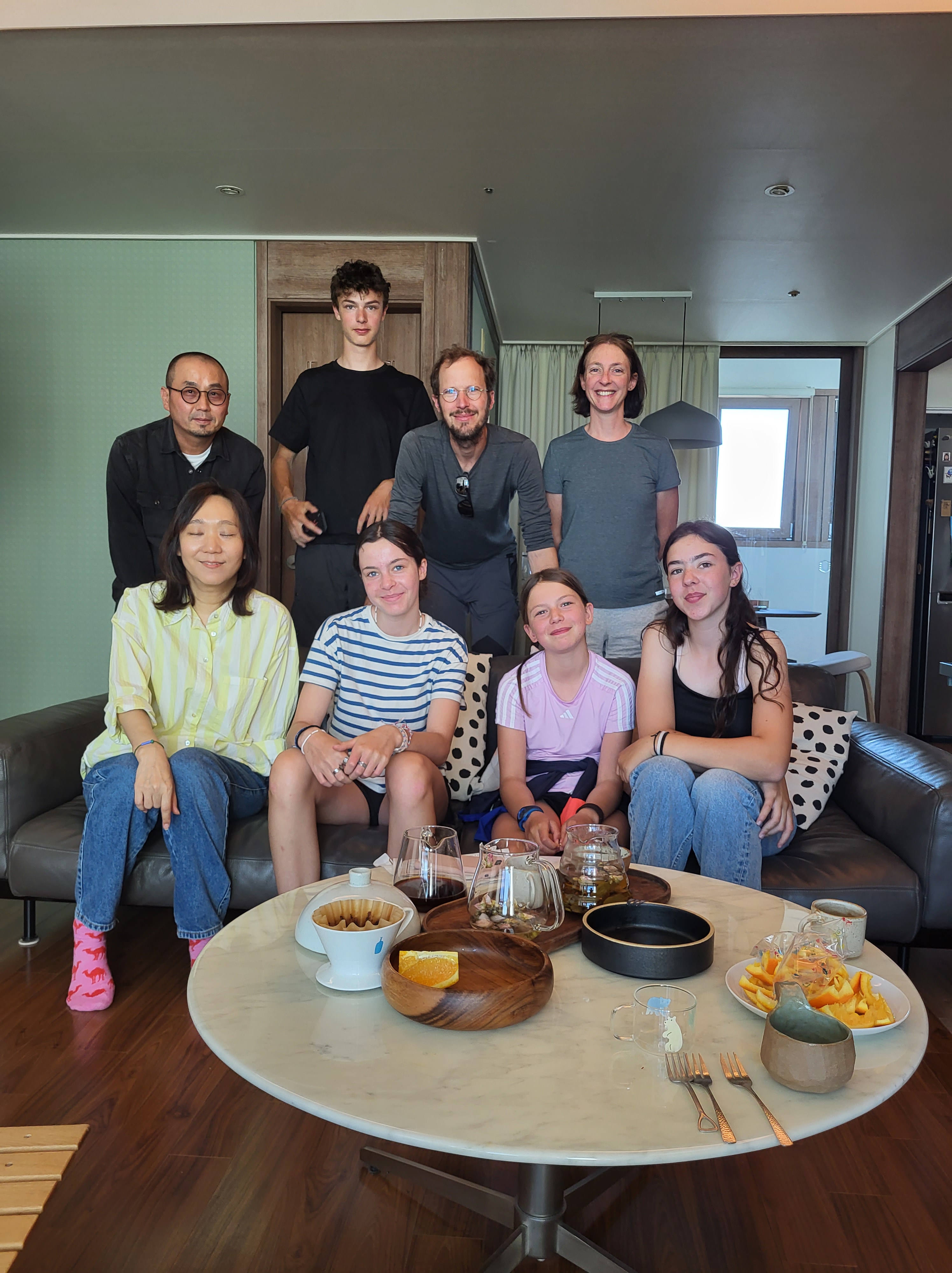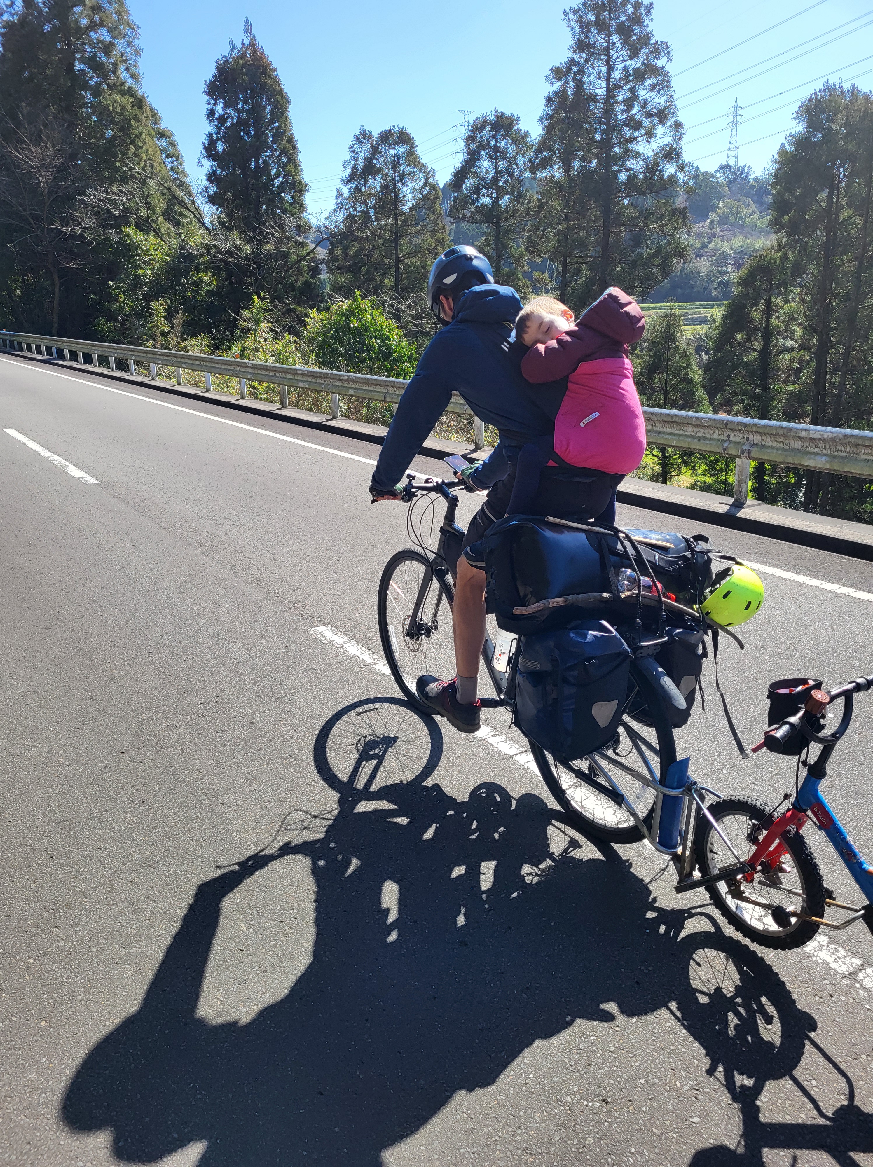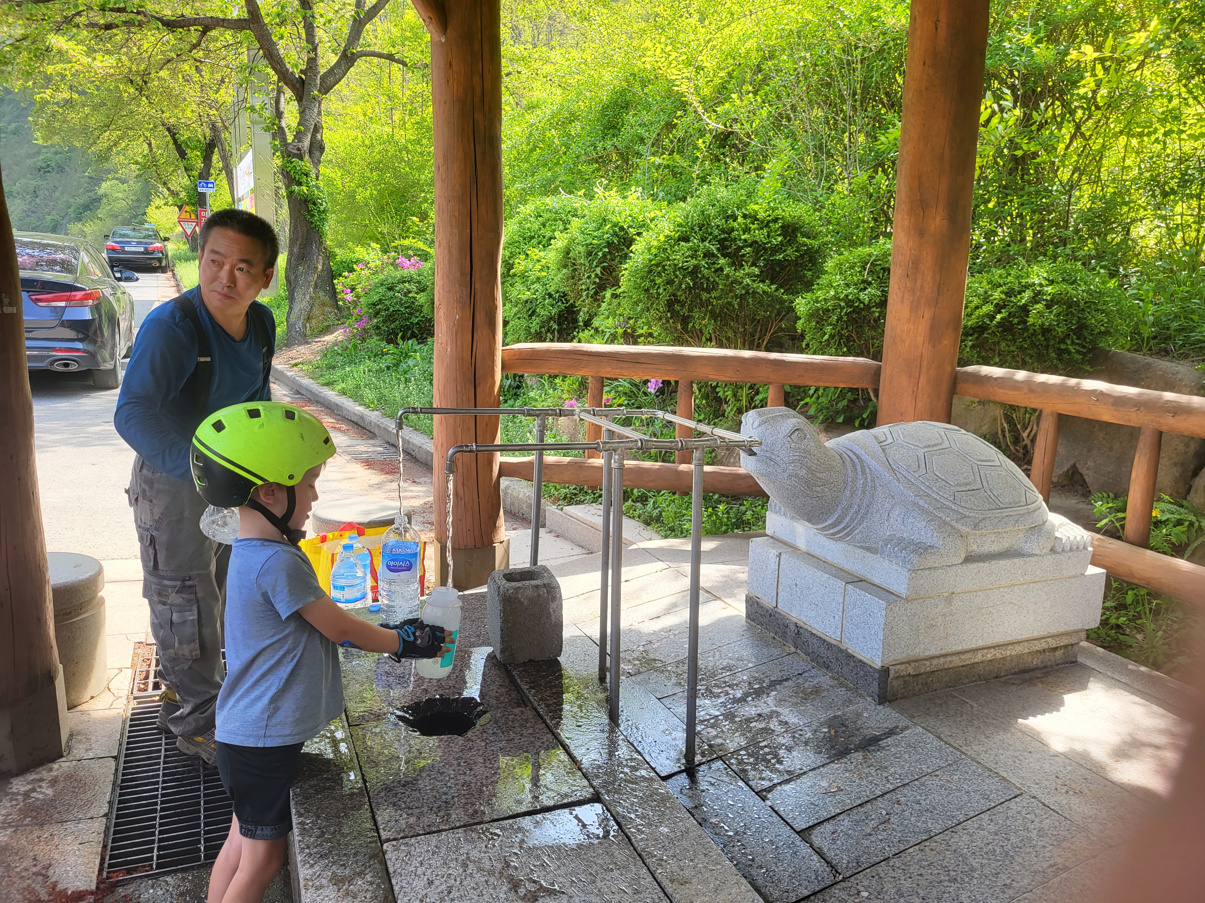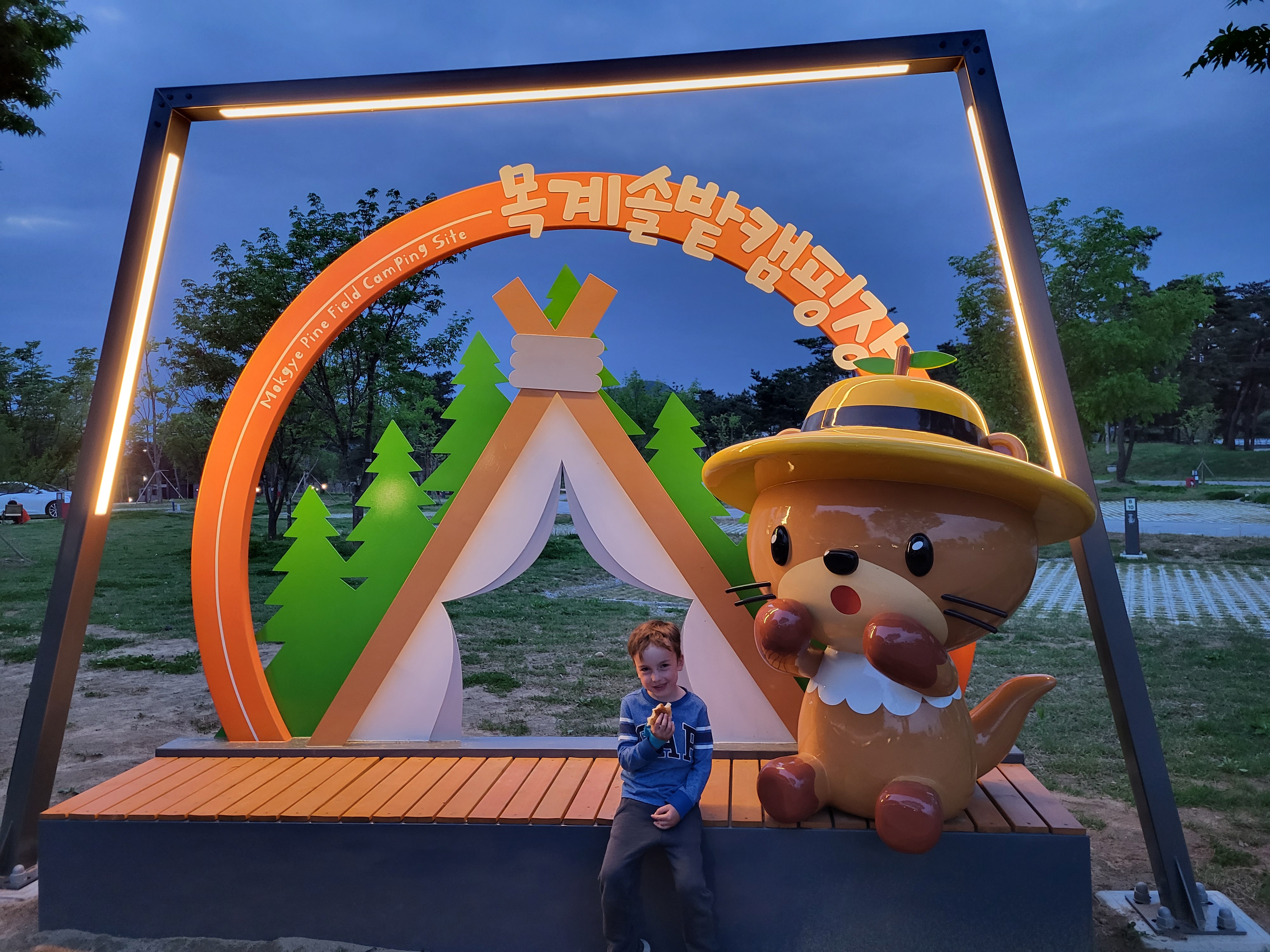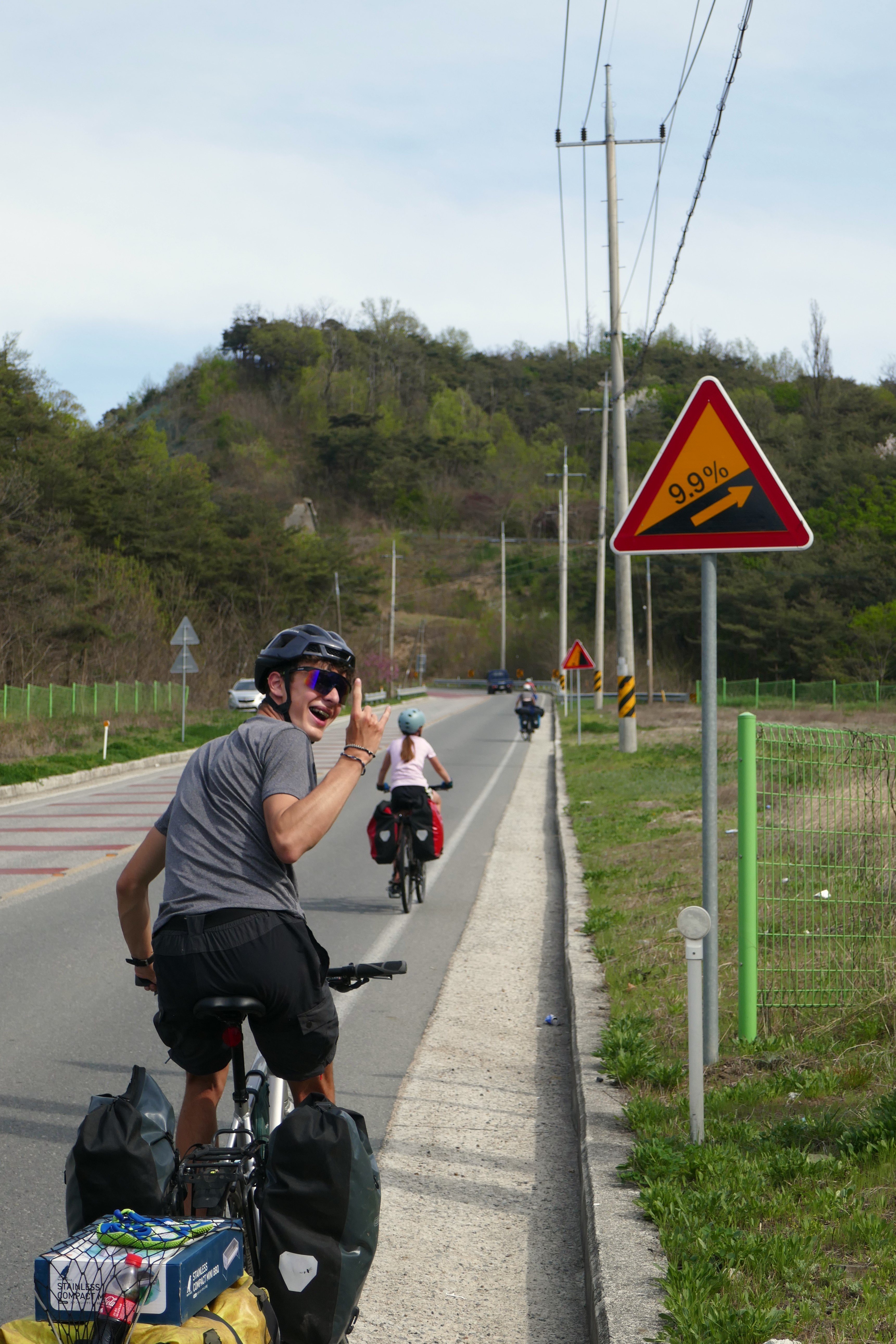 Au fil des kilomètres, nous continuons d’expérimenter la générosité extraordinaire des habitants. Des cyclistes s’arrêtent pour donner aux enfants les ravitaillements qu’ils avaient prévus pour eux. Dans les campings, il n’y a pas eu un soir où nous n’avons pas reçu de la nourriture (du kimchi bien sûr, le plat traditionnel coréen fait de légumes lactofermentés plus ou moins épicés), une table et des tabourets à prêter (on devait faire un peu pitié accroupis autour de notre butagaz…), et jusqu’à … 5 boites de 200 mouchoirs ! A deux reprises, nous nous sommes même fait avancer le coût de notre camping suivant par des gens rencontrés quelques minutes auparavant et que nous avions sollicités pour nous aider à réserver sur des sites en coréen (on vous racontera de vive voix comme il est fastidieux de réserver un camping en Corée du Sud, notamment parce que seuls des modes de paiements électroniques domestiques sont prévus, et parce qu’il faut toujours encoder la plaque d’immatriculation de sa voiture…).
