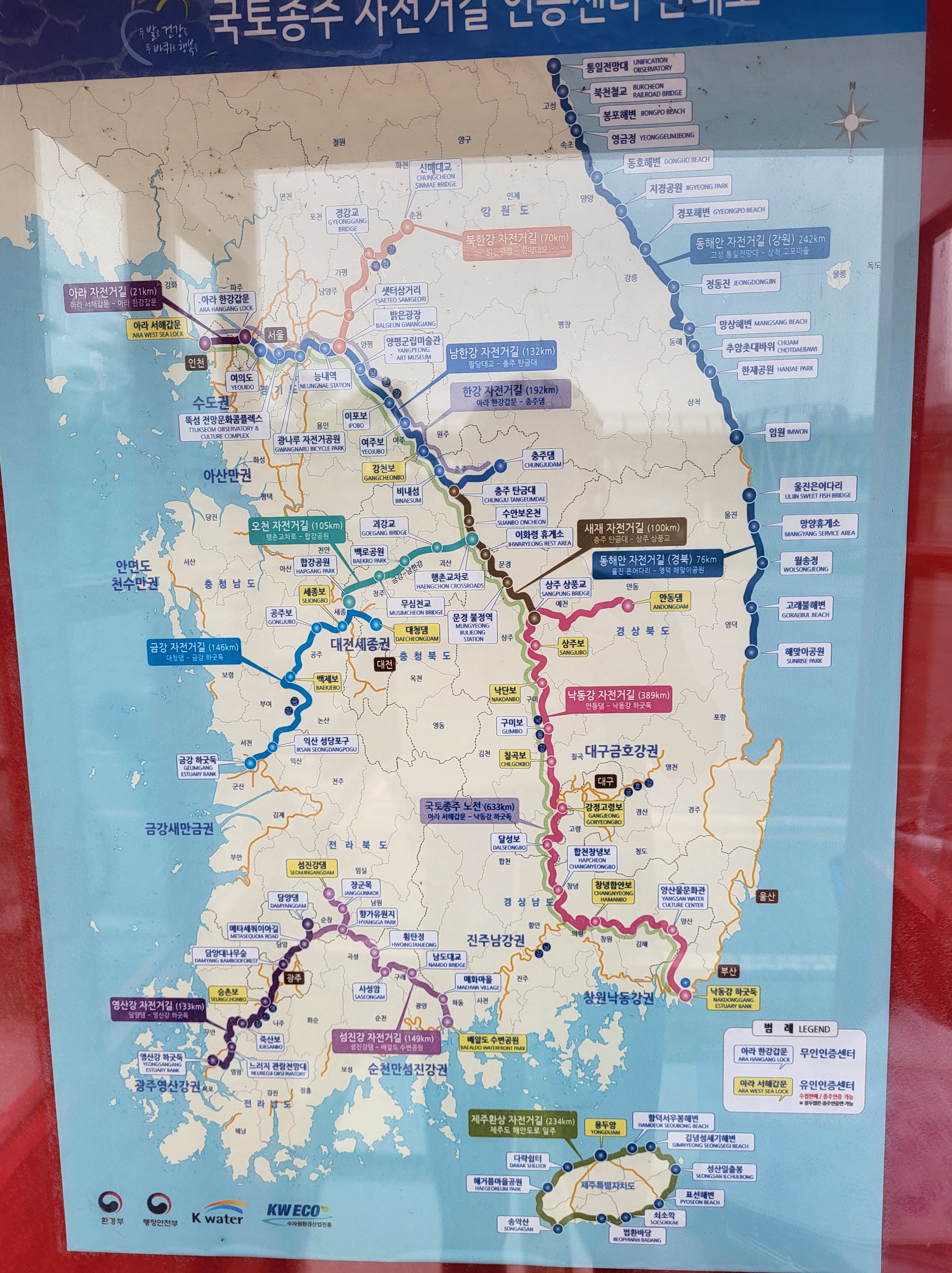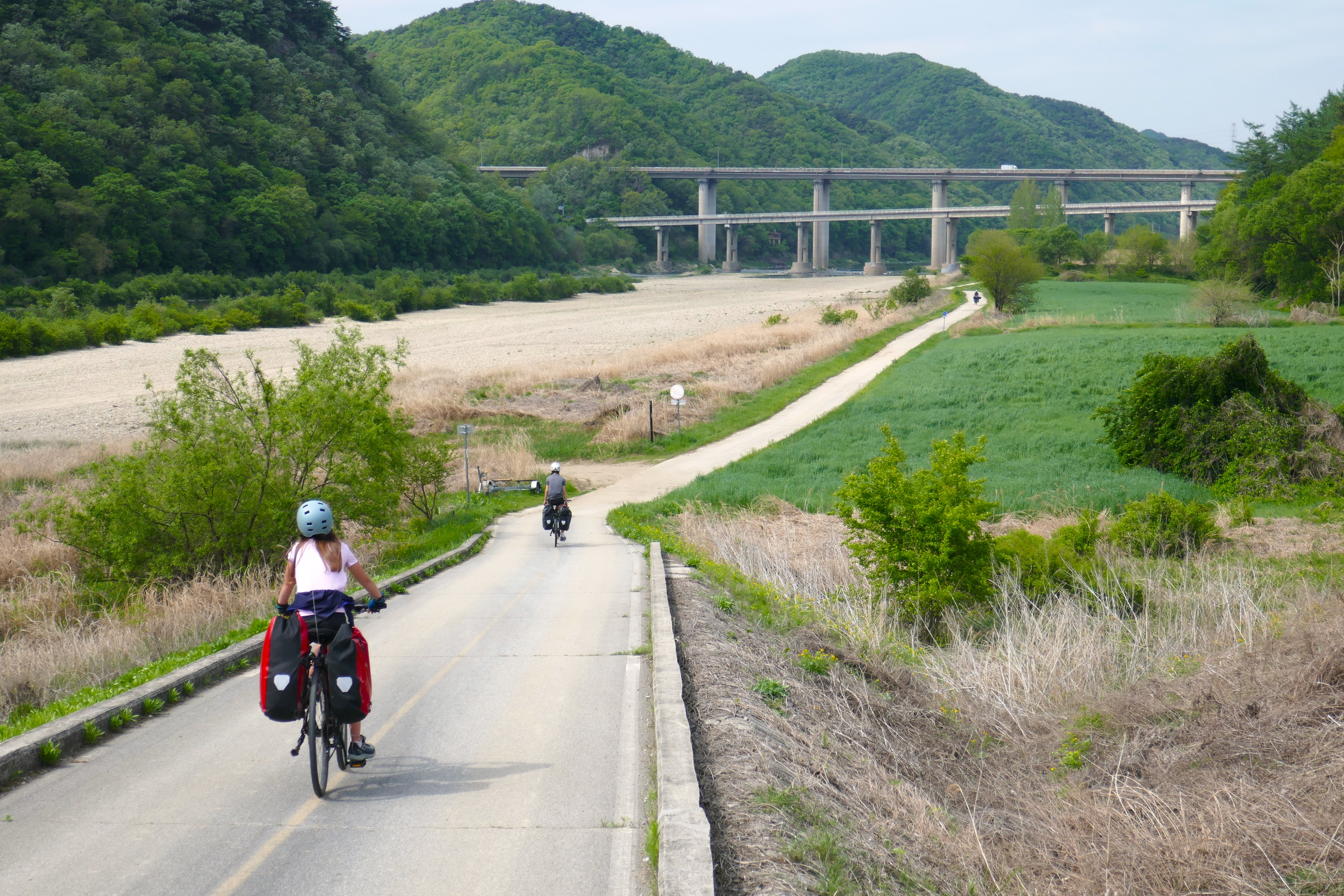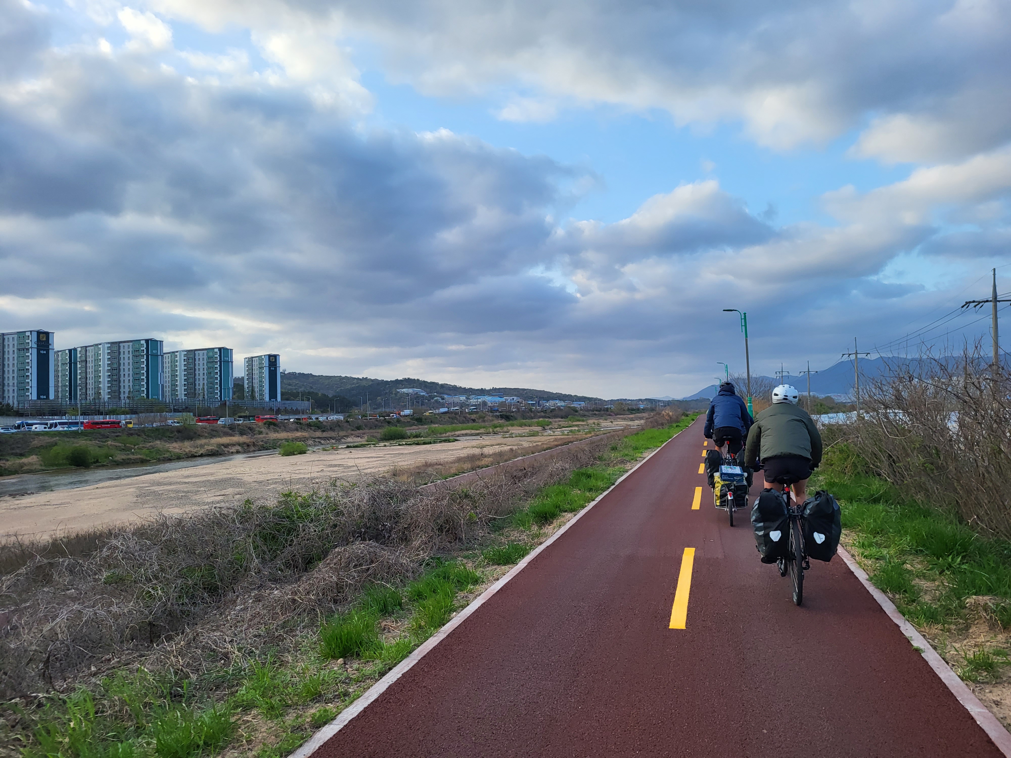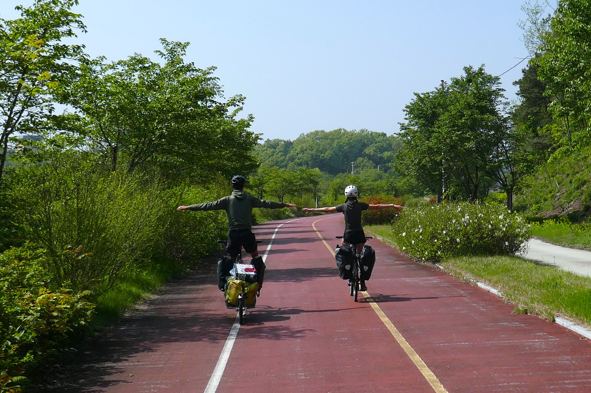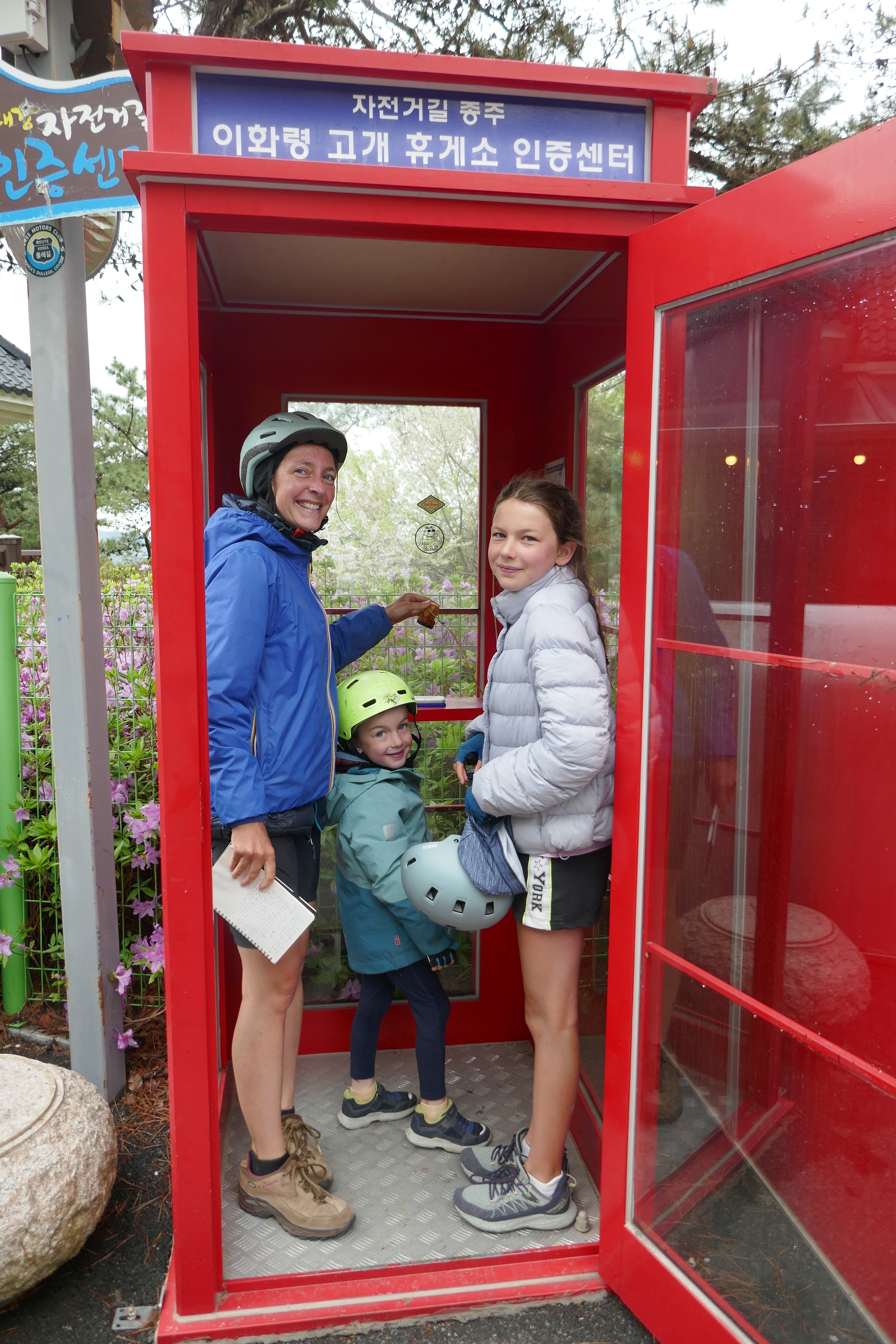 Nous voici au terme de notre voyage, à Séoul, que nous avons rejoint via la piste cyclable « des 4 rivières », qui fait partie du vaste réseau de plus de 1.700 kilomètres traversant le pays sur plusieurs axes. La majeure partie du tracé est en site propre, et on en a profité un max ! Cela nous a tellement changé des 2 x 4 bandes de nos débuts en Corée du Sud… Tout au long du parcours, il y a de nombreuses pagodes sur le bord de la route qui invitent à la pause, des toilettes, parfois des points de ravitaillement en eau et même de petits ateliers d’autoréparation de vélo. On a aussi retrouvé quelques poubelles publiques, ce qui a son importance (au Japon, il n’en existe pratiquement pas, ce qui surprend dans un pays où tout est suremballé, et ce qui nous a parfois quelque peu compliqué la tâche). Des cabines téléphoniques rouges annoncent des « certification points », où l’on peut apposer un cachet dans un petit carnet, preuve du passage au point donné. Un carnet rempli donne droit à un sticker dans le passeport, délivré par les autorités.