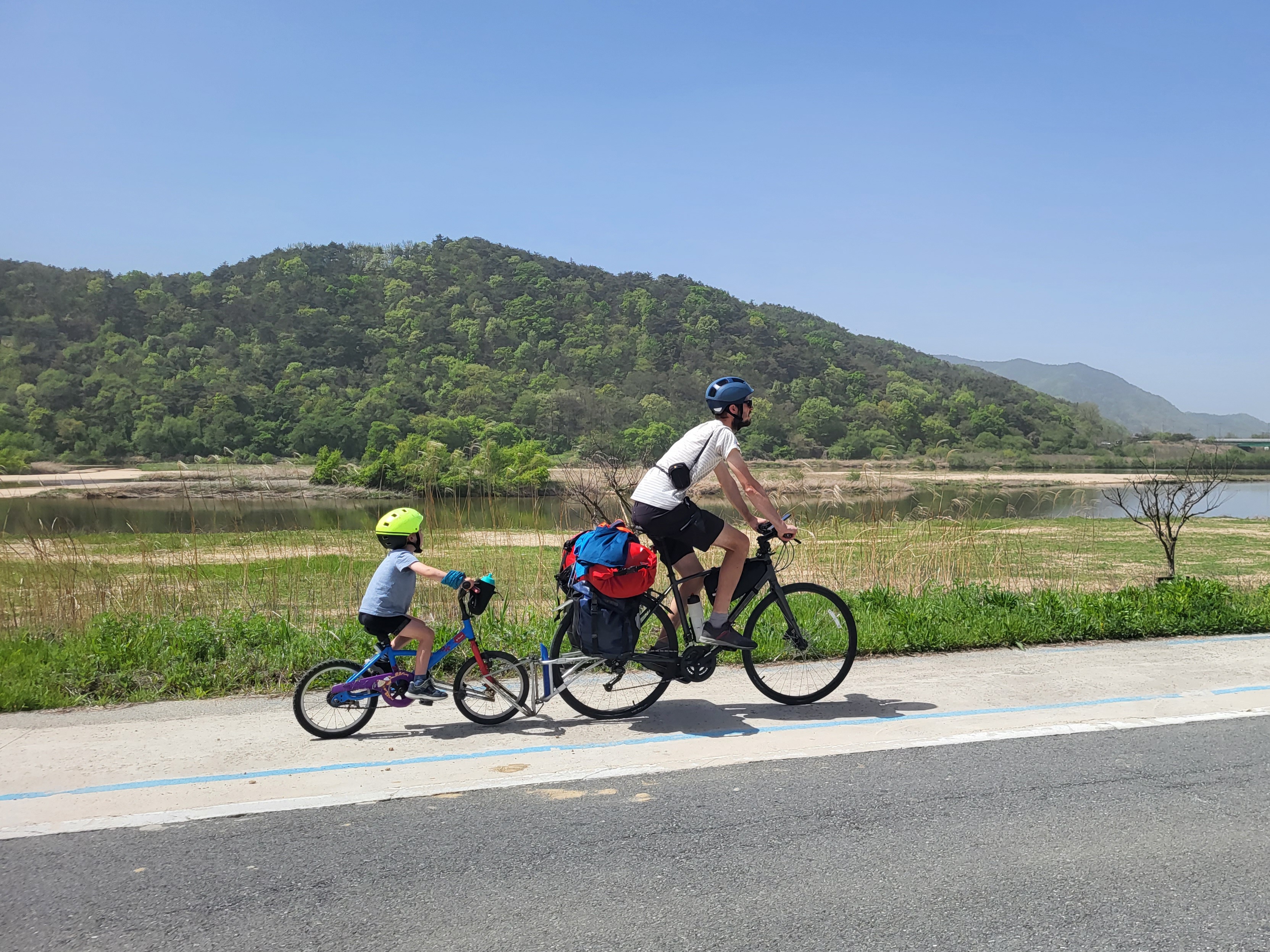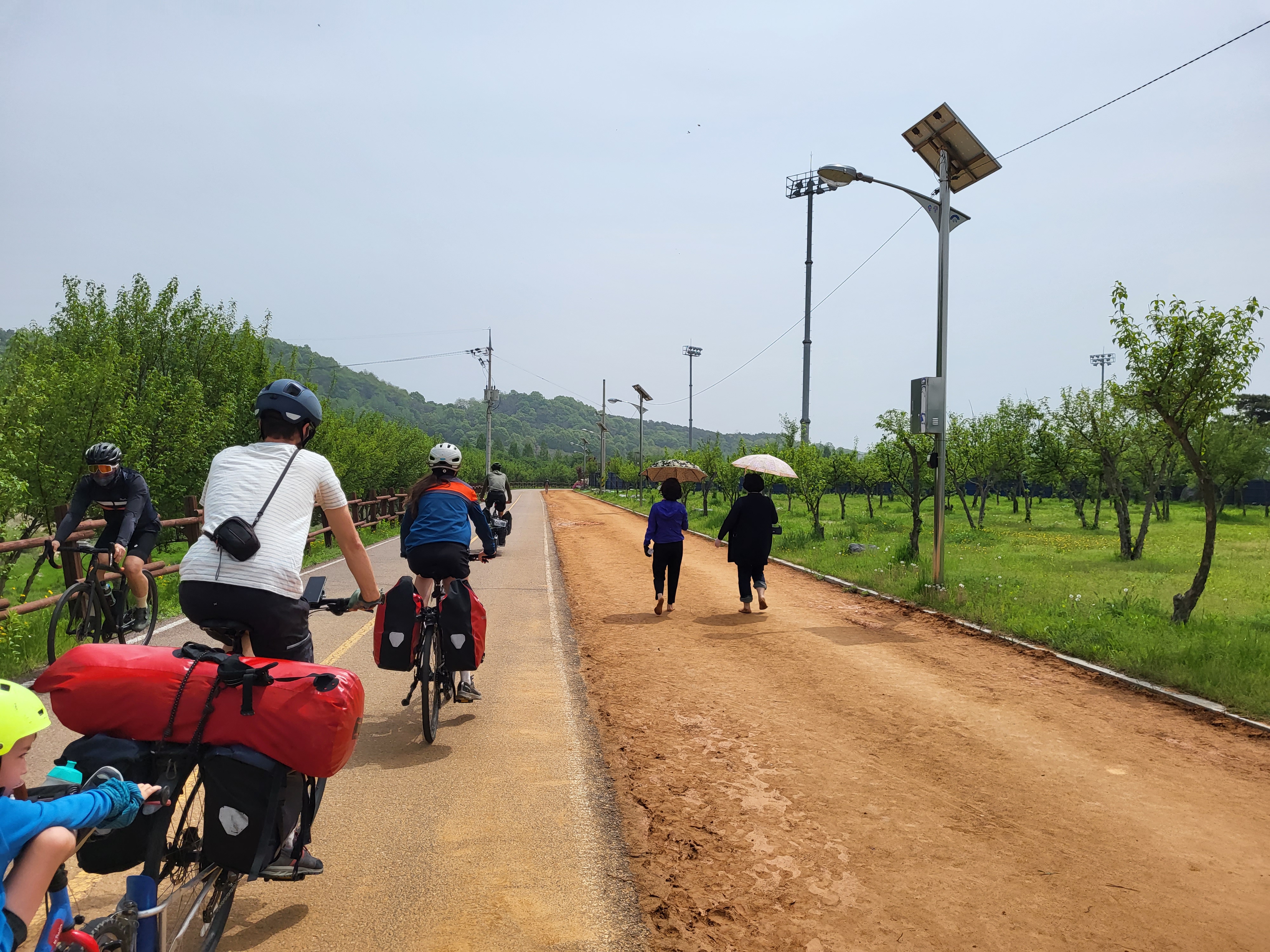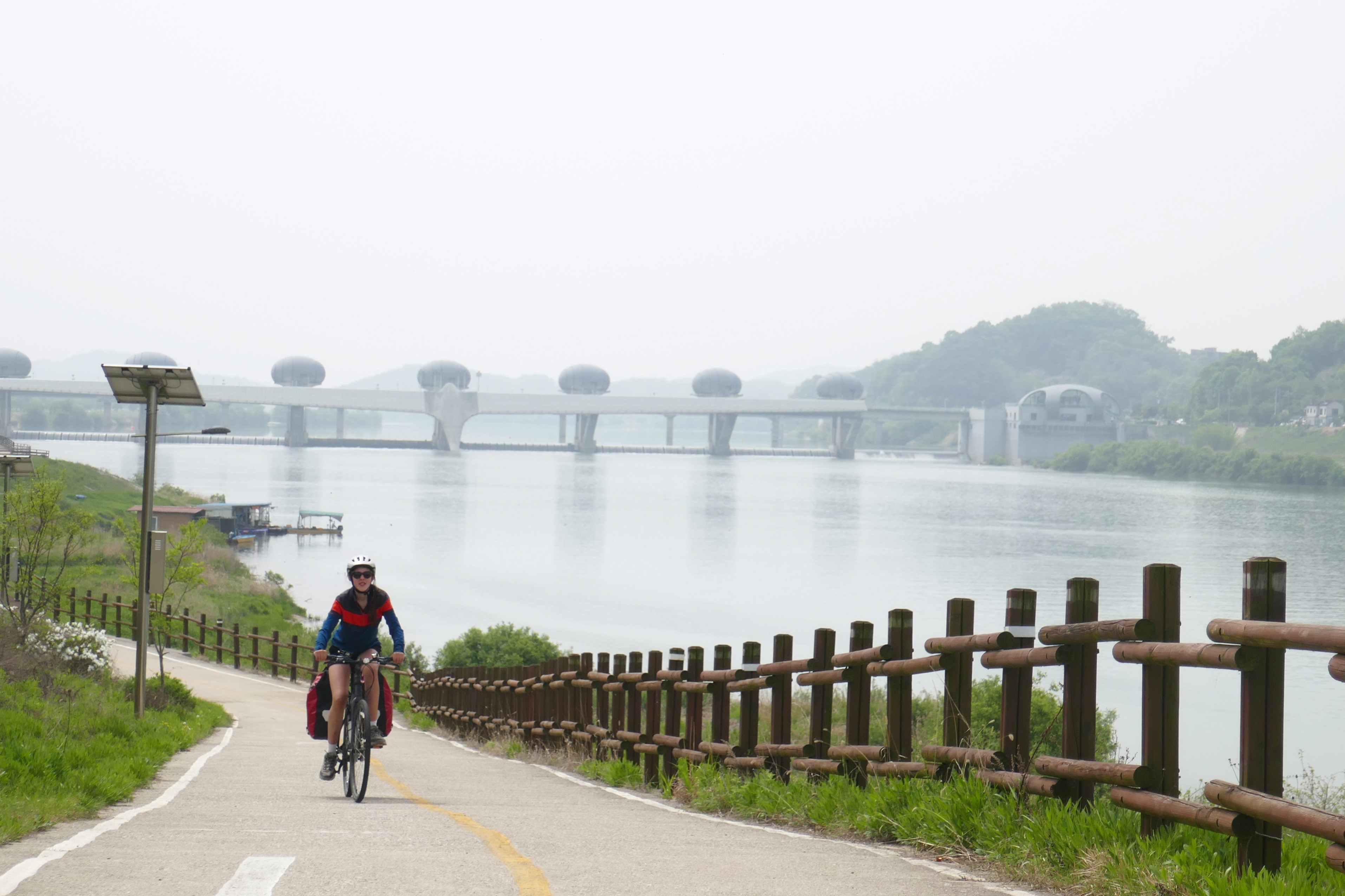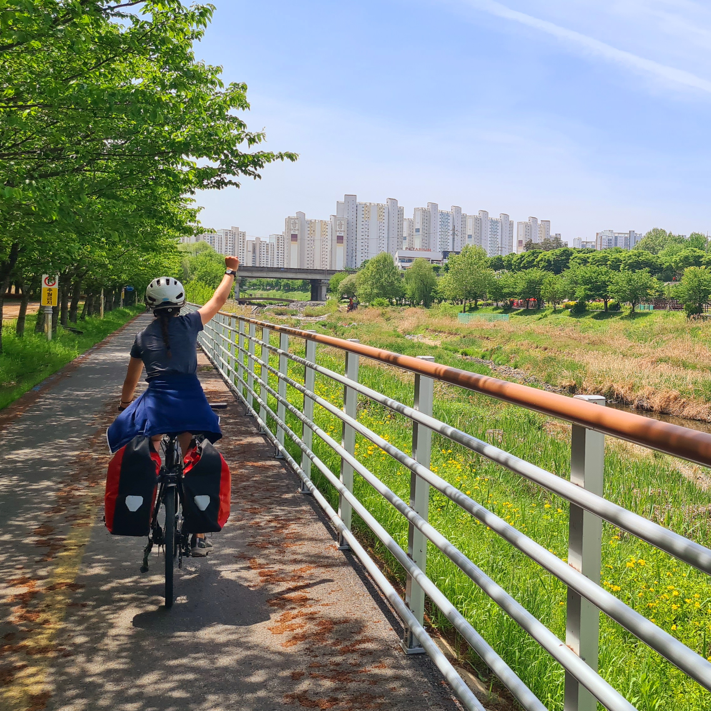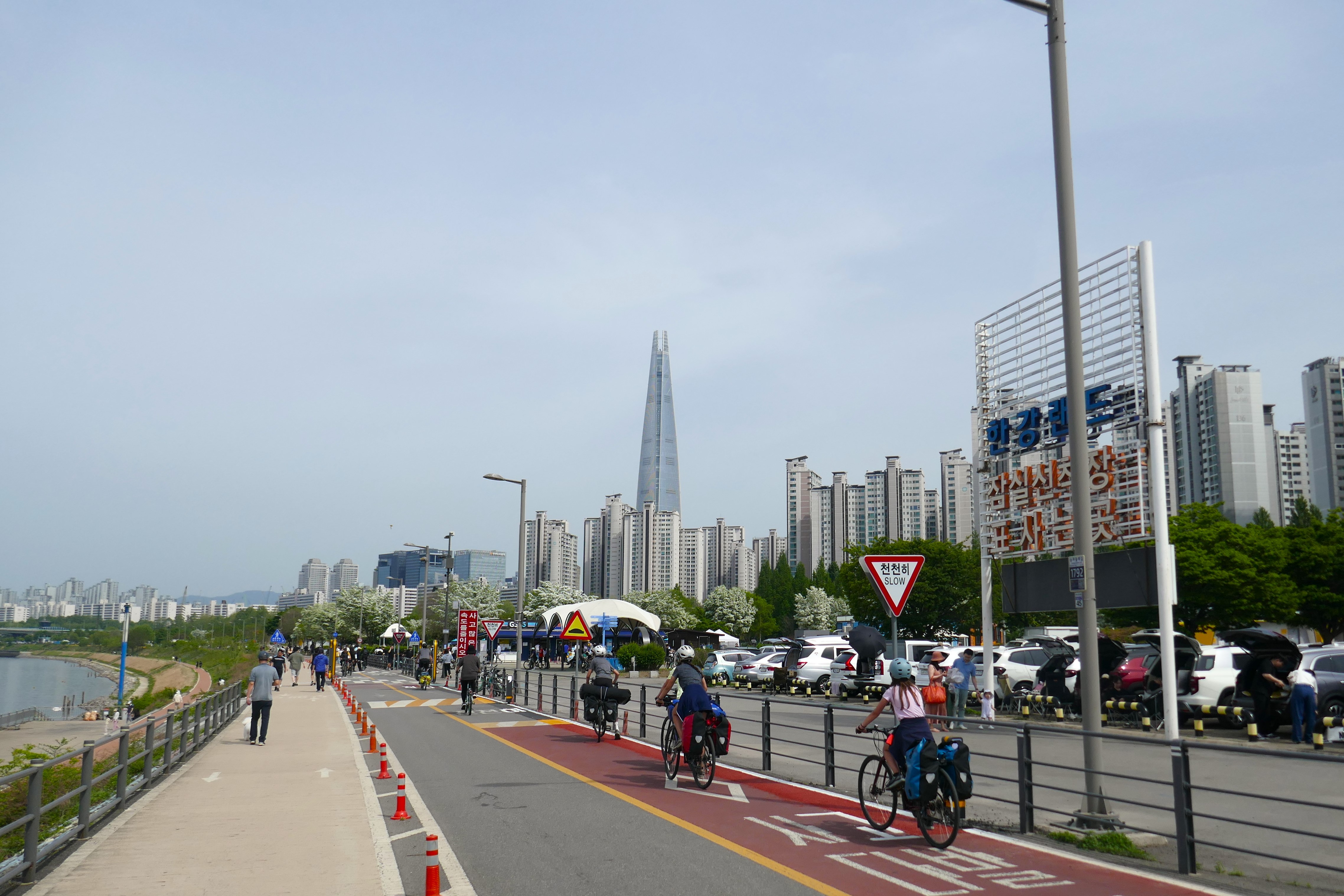 L’entrée dans Séoul fut vraiment un chouette moment, par un dimanche très ensoleillé, entourés de centaines de cyclistes dans un ambiance mêlée de « 20 kilomètres de Bruxelles » et de « dimanche sans voiture ». Il faut dire que les Coréens sont des amoureux du vélo. Beaucoup roulent sur des modèles dernier cri (et couverts littéralement de la tête aux pieds, le visage entièrement masqué, pas un centimètre de peau ne devant être exposé au soleil, ce qui surprend un peu au début). D’autres utilisent les vélos et tandems mis en location en de nombreux endroits le long de la piste.