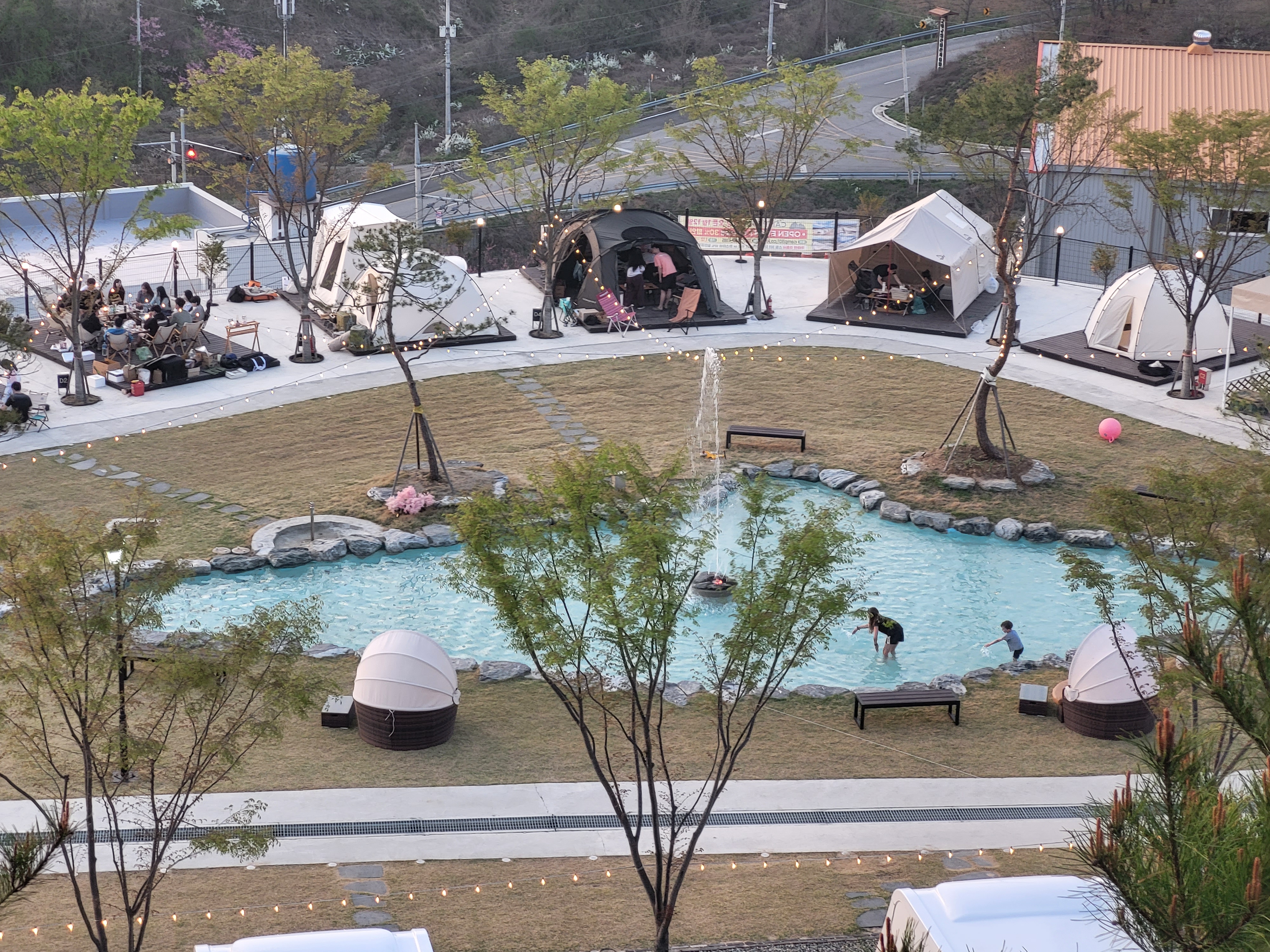 Les campings où nous nous arrêtons sont vastes et au décorum parfois étonnant. Ils rivalisent aussi d’illuminations qui se révèlent le soir venu.